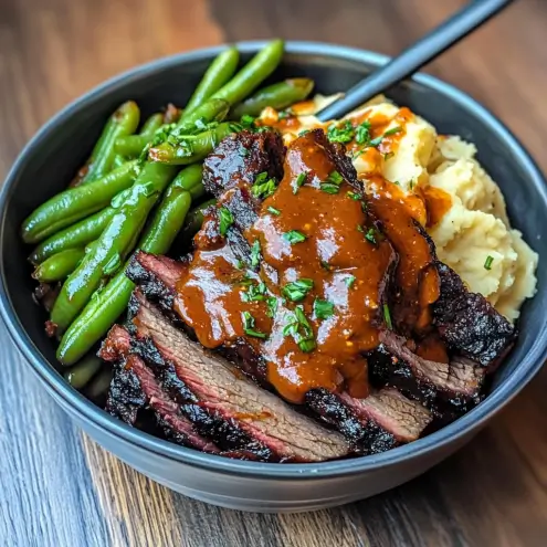 BBQ Brisket Bowl with Mashed Potatoes & Green Beans is a comforting, hearty dish that combines tender, flavorful brisket with creamy mashed potatoes and crisp green beans. The slow-cooked brisket is infused with smoky, tangy BBQ sauce, creating the perfect balance of savory and sweet flavors. Paired with mashed potatoes, which are rich and buttery, and green beans that provide a fresh crunch, this dish is a true crowd-pleaser. Whether you’re cooking for a family dinner, a special occasion, or just looking for a satisfying meal, this BBQ Brisket Bowl with Mashed Potatoes & Green Beans will undoubtedly become a favorite. The combination of flavors and textures makes this meal an unforgettable comfort food experience.