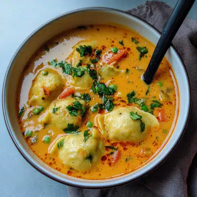 Coconut curry soup is a popular dish in various global cuisines, from Southeast Asia to the Middle East, and it has been adapted in many ways over time. The creamy, fragrant coconut milk blends seamlessly with the vibrant curry spices, creating a base that is both rich and comforting. The dumplings add a hearty touch, making this soup a complete meal that will warm you from the inside out.
