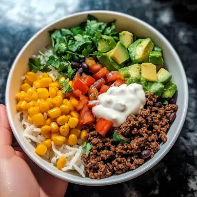 - Add the Beef: Spoon the seasoned ground beef on top of the rice, spreading it evenly across the bowl.
