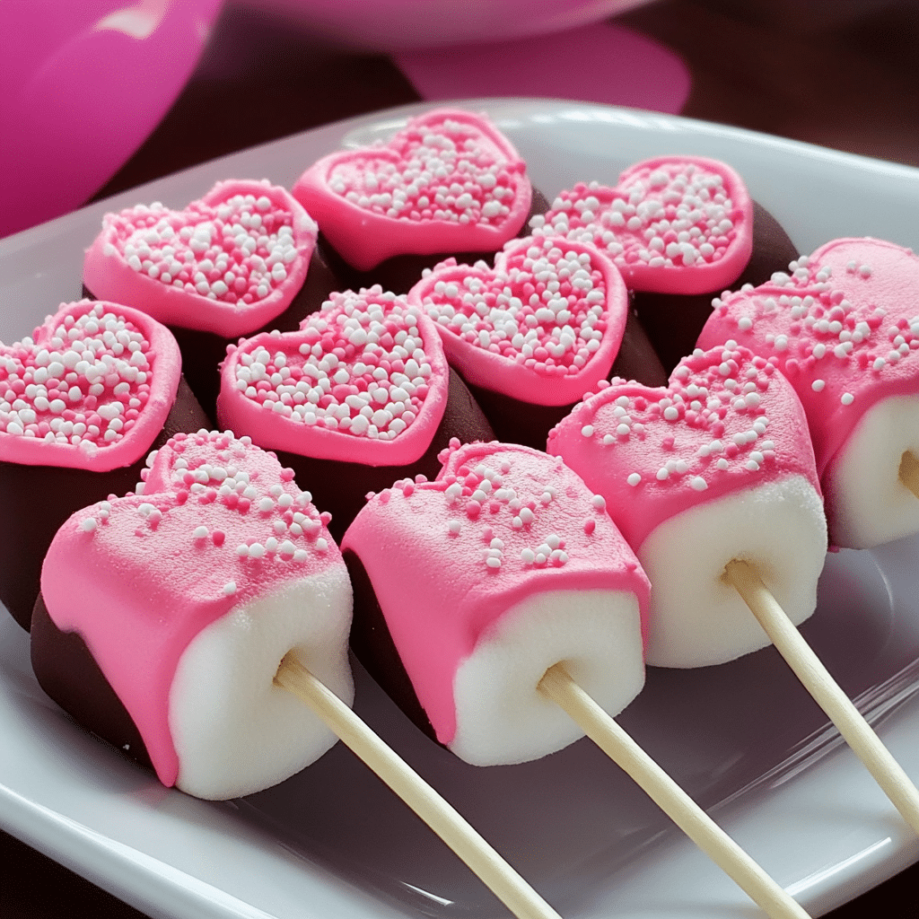 - Decorate the Pops: Immediately after dipping in chocolate, roll or sprinkle the marshmallow in your choice of sprinkles, heart-shaped candies, edible glitter, or crushed graham crackers. Get creative with your decorations! You can use a mix of pink, red, and white sprinkles for a fun, festive look.